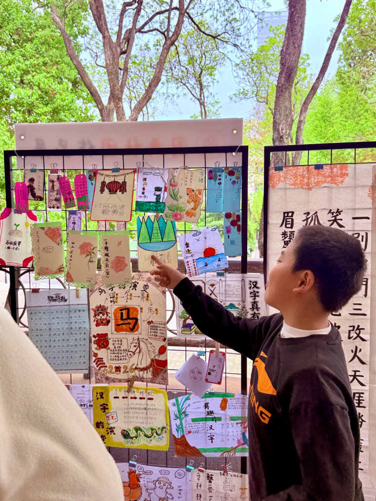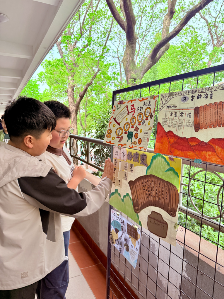 活动期间,五年级的走廊变成了热闹的“汉字文化市集”。集中展示了评选出的优秀书法、图画、字谜等作品。课间时分,这里总是挤满了参观学习的同学,大家或猜谜互动,或品评书法,沉浸在汉字的世界里。